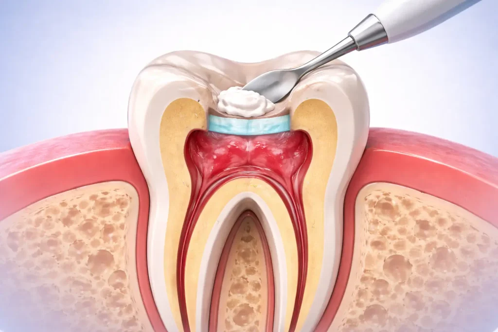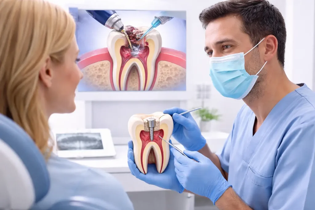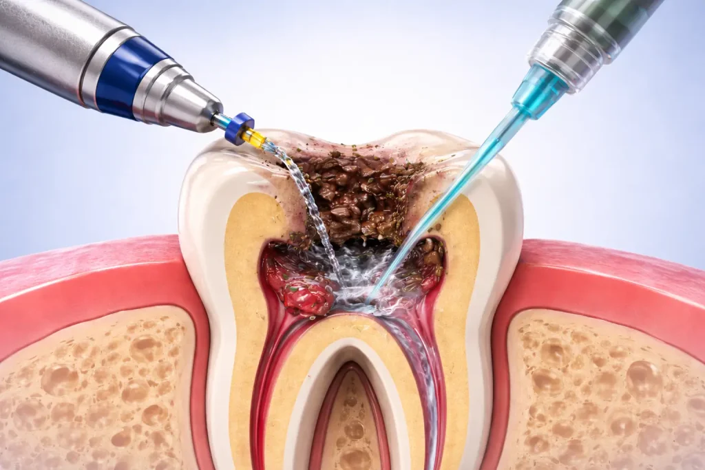 Root canal treatment is performed to remove infected or damaged pulp from داخل the tooth, تنظيف the root canals, and seal them to prevent reinfection. This procedure helps eliminate pain, preserve the natural tooth, and restore normal function. At Duri Clinic, we use modern techniques to ensure precision and patient comfort throughout the process.