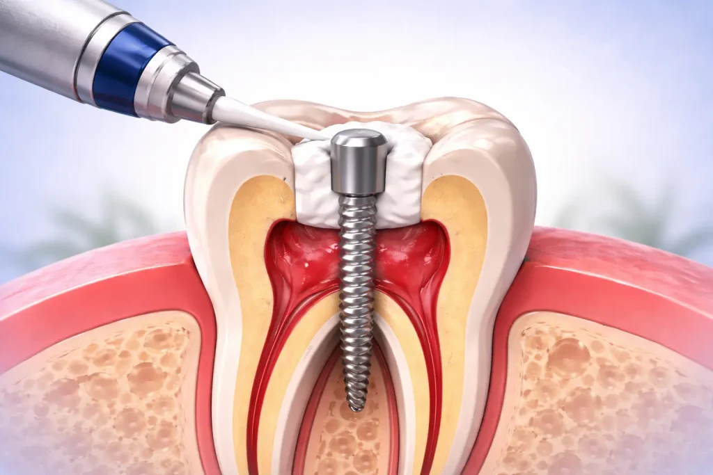 After a root canal treatment, a post and core build-up may be required to strengthen the tooth and provide support for a crown. This helps restore the tooth’s structure and ensures long-term durability and function.